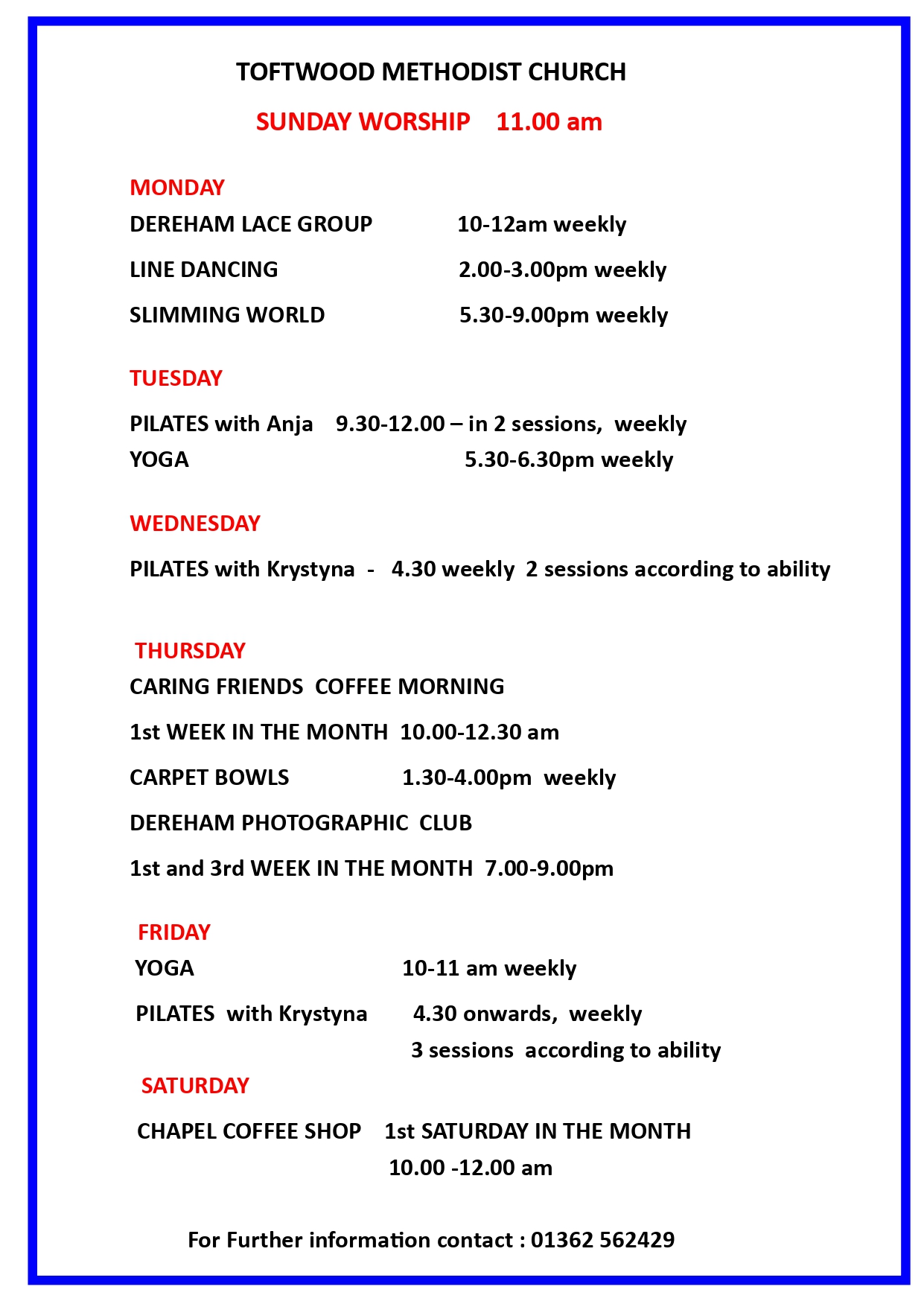 Address: Toftwood Methodist Church, Chapel Lane, Toftwood, NR19 1LD